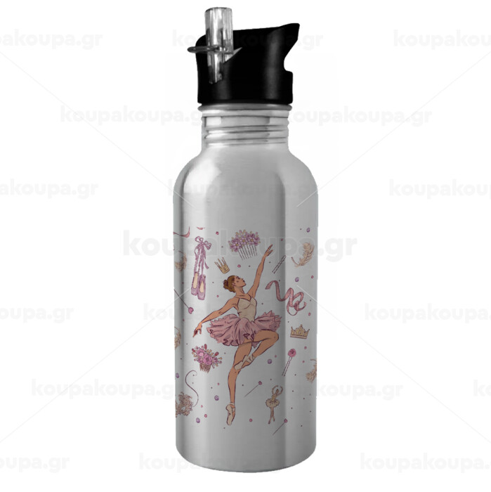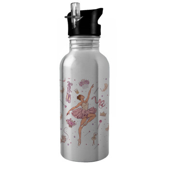 Ballet Dancer, Water bottle Silver with straw, stainless steel 600ml