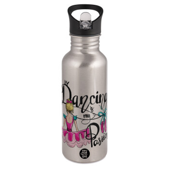Dancing is my Passion, Water bottle Silver with straw, stainless steel 600ml