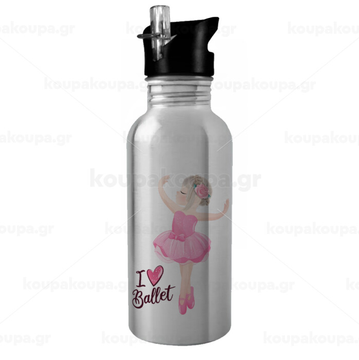 I Love Ballet, Water bottle Silver with straw, stainless steel 600ml