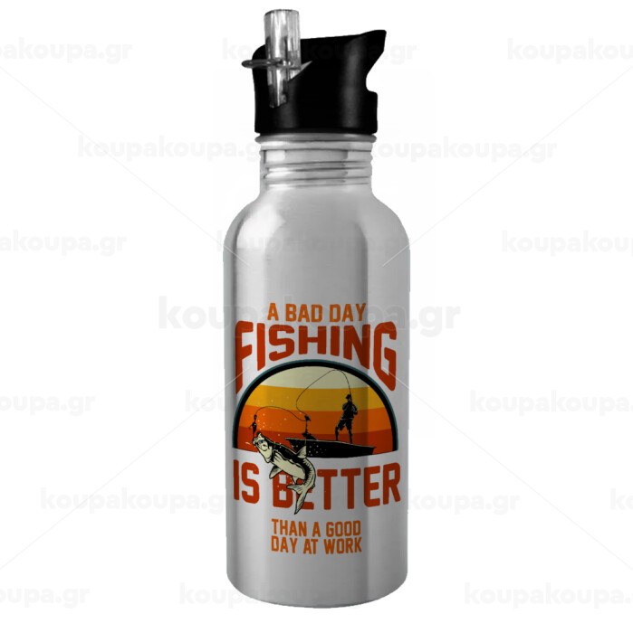 A bad day FISHING is better than a good day at work, Water bottle Silver with straw, stainless steel 600ml