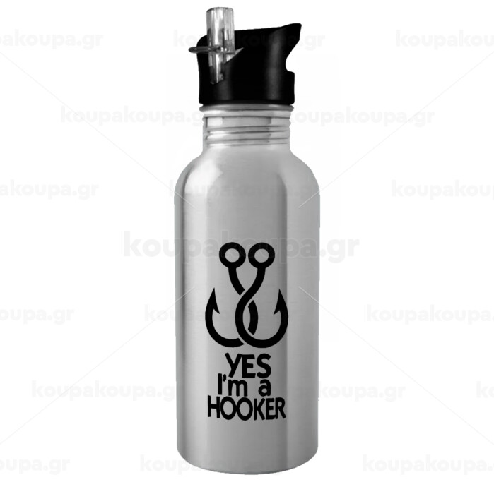 Yes i am Hooker, Water bottle Silver with straw, stainless steel 600ml