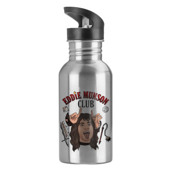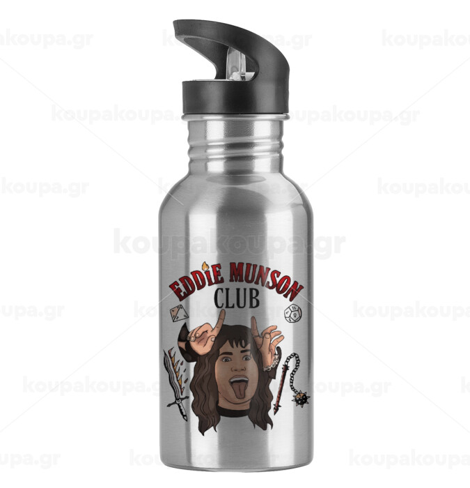 Eddie Munson, Hellfire CLub, Stranger Things, Water bottle Silver with straw, stainless steel 600ml