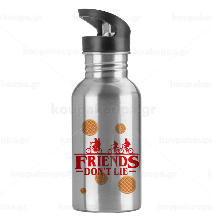 Friends Don't Lie, Stranger Things, Water bottle Silver with straw, stainless steel 600ml