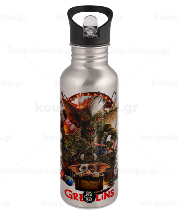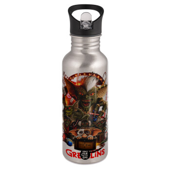 Gremlins, Water bottle Silver with straw, stainless steel 600ml