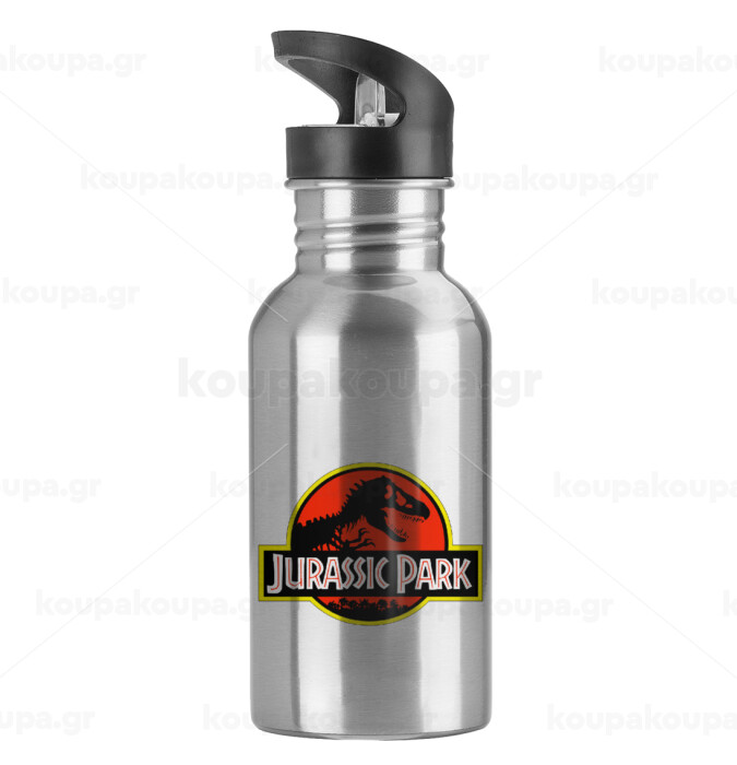 Jurassic park, Water bottle Silver with straw, stainless steel 600ml