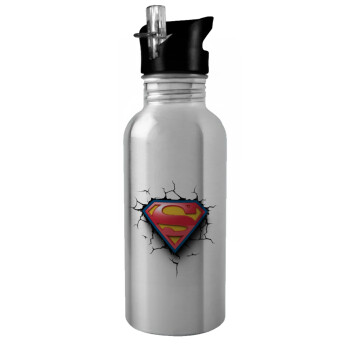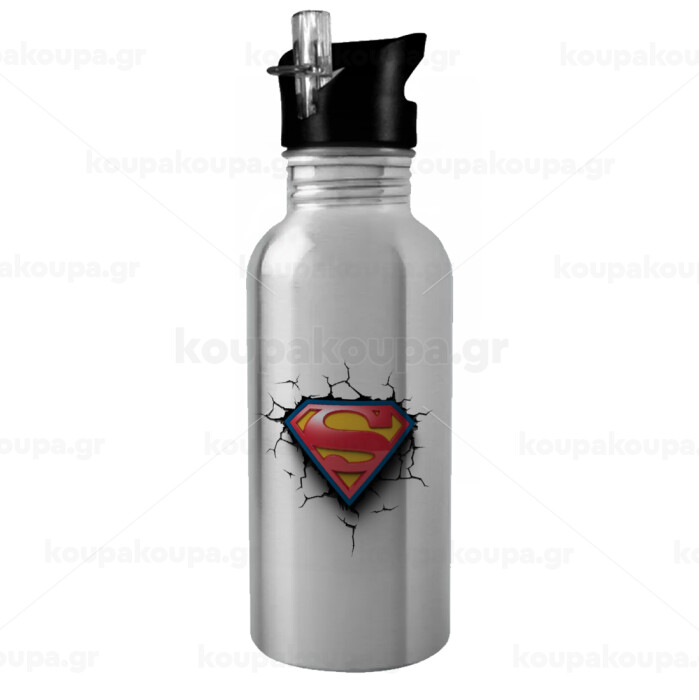 Superman cracked, Water bottle Silver with straw, stainless steel 600ml