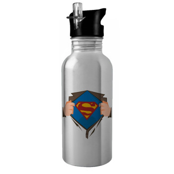 Superman hands, Water bottle Silver with straw, stainless steel 600ml