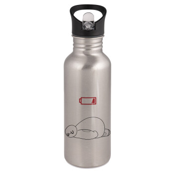 Baymax battery low, Water bottle Silver with straw, stainless steel 600ml