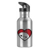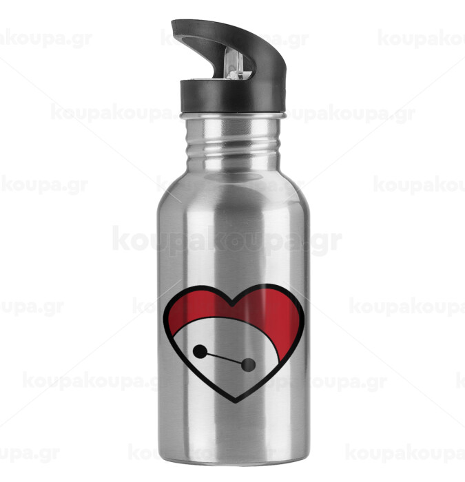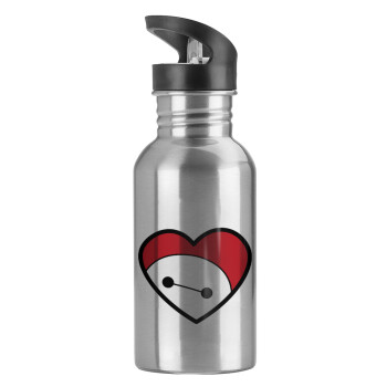 Baymax heart, Water bottle Silver with straw, stainless steel 600ml