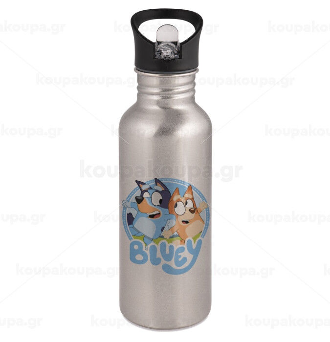 Μπλε, Water bottle Silver with straw, stainless steel 600ml
