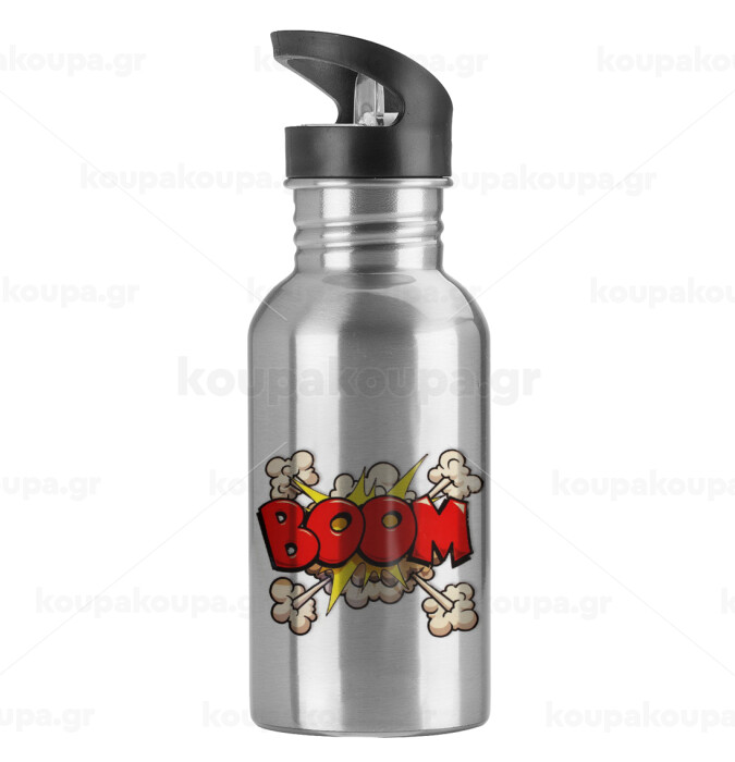 BOOM!!!, Water bottle Silver with straw, stainless steel 600ml