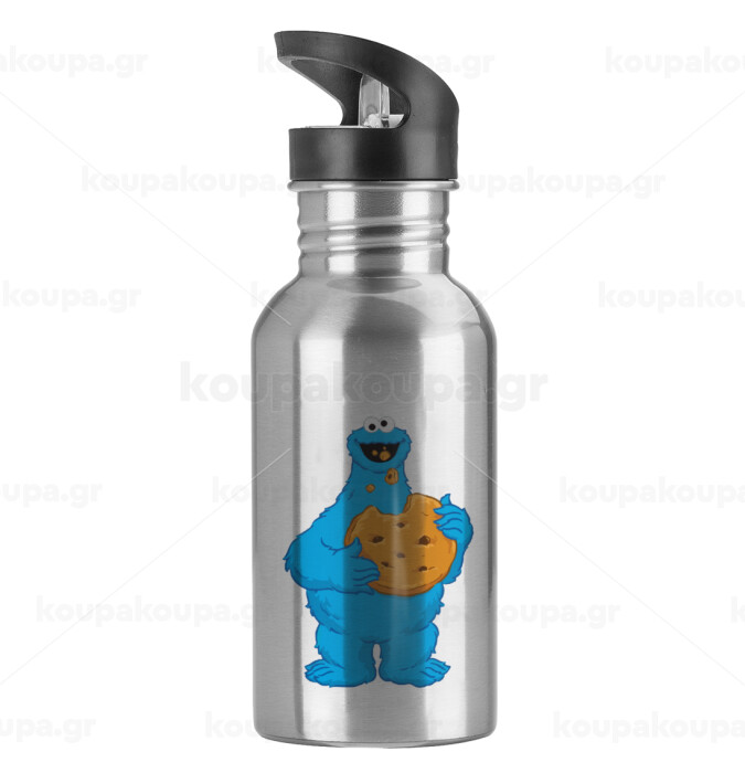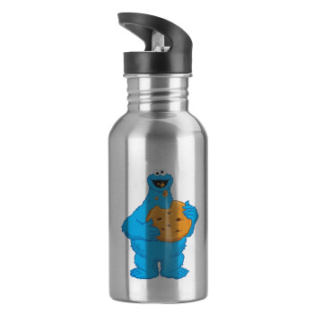 Cookie Monster, Water bottle Silver with straw, stainless steel 600ml