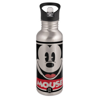Mickey Mouse, Water bottle Silver with straw, stainless steel 600ml