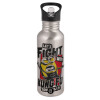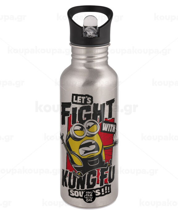 Minions Let's fight with kung fu sounds, Water bottle Silver with straw, stainless steel 600ml