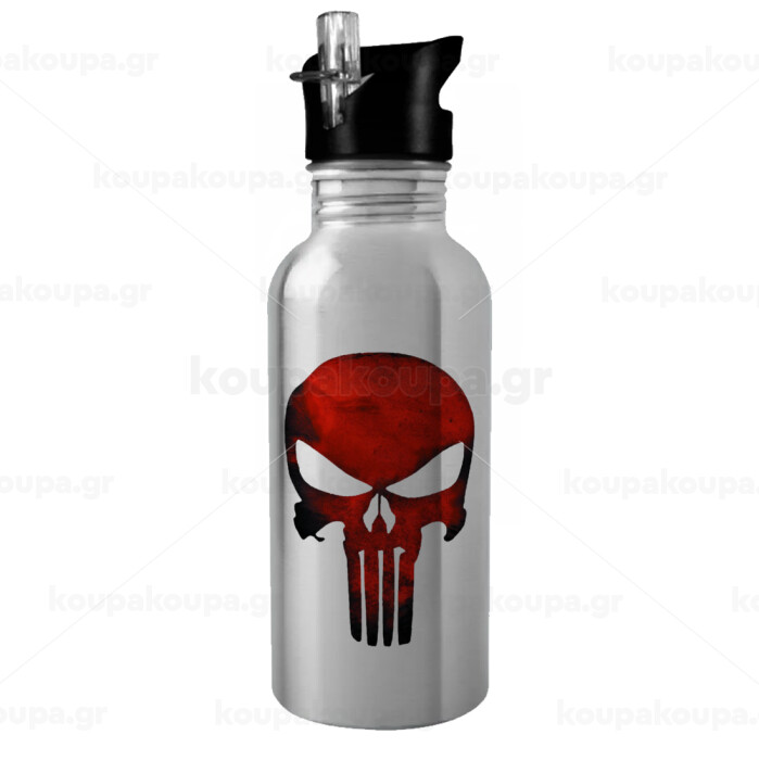 Red skull, Water bottle Silver with straw, stainless steel 600ml