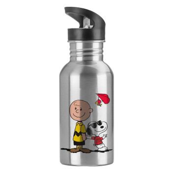Snoopy & Joe, Water bottle Silver with straw, stainless steel 600ml
