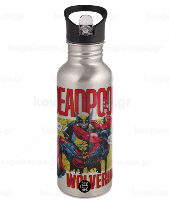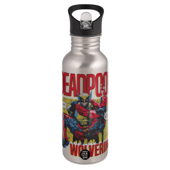 Superhero Deadpool Wolverine, Water bottle Silver with straw, stainless steel 600ml