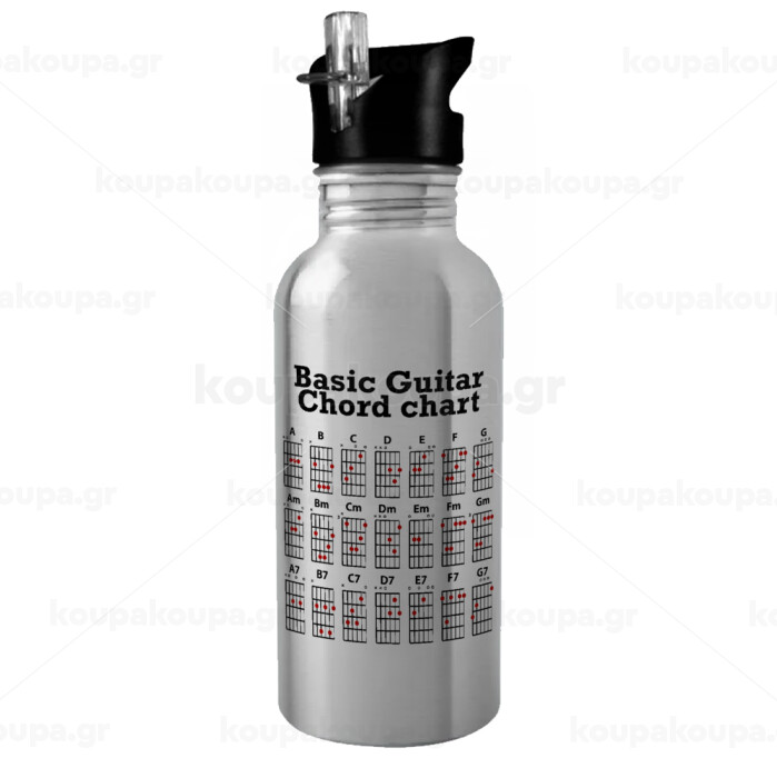 Guitar tabs, Water bottle Silver with straw, stainless steel 600ml