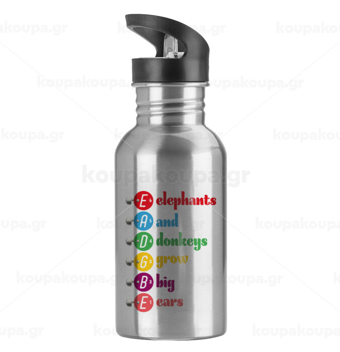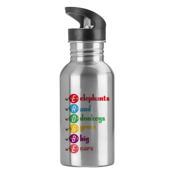 Elephants And Donkeys Grow Big Ears, Water bottle Silver with straw, stainless steel 600ml