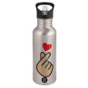 Korean Finger Heart, Water bottle Silver with straw, stainless steel 600ml