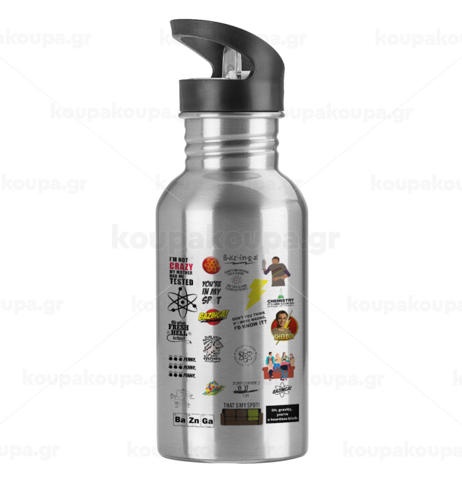 The Big Bang Theory pattern, Water bottle Silver with straw, stainless steel 600ml