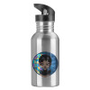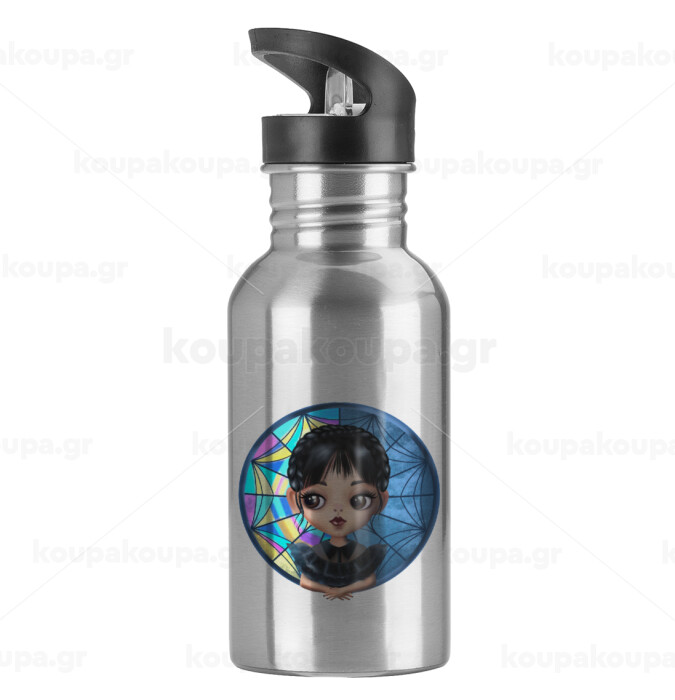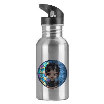 Wednesday big eyes, Water bottle Silver with straw, stainless steel 600ml