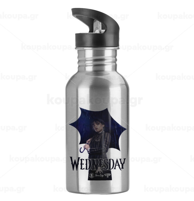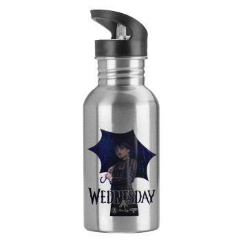 Wednesday rain, Water bottle Silver with straw, stainless steel 600ml