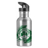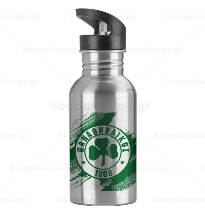 Π.Α.Ο., Water bottle Silver with straw, stainless steel 600ml