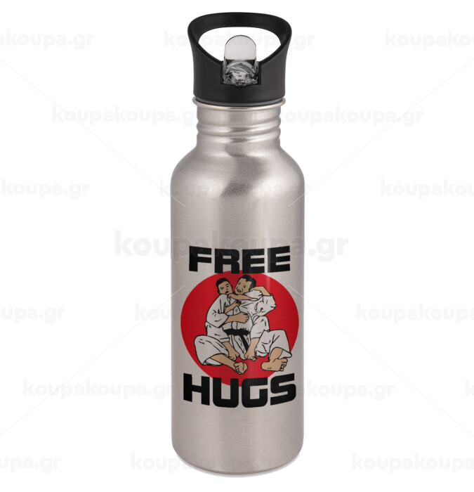 JUDO free hugs, Water bottle Silver with straw, stainless steel 600ml