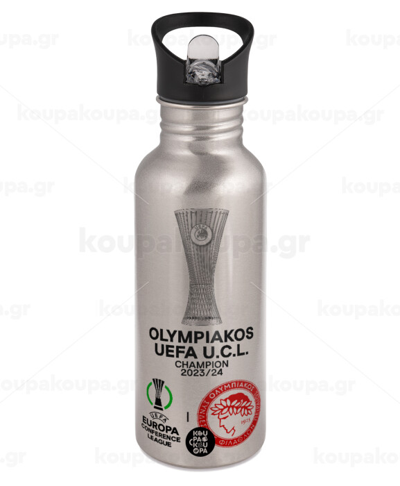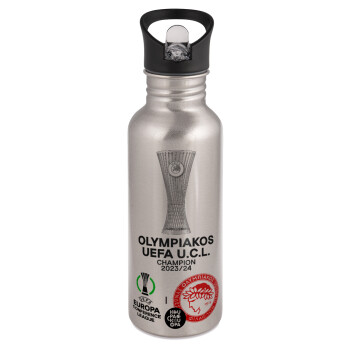 Olympiacos UEFA Europa Conference League Champion 2023/24, Water bottle Silver with straw, stainless steel 600ml
