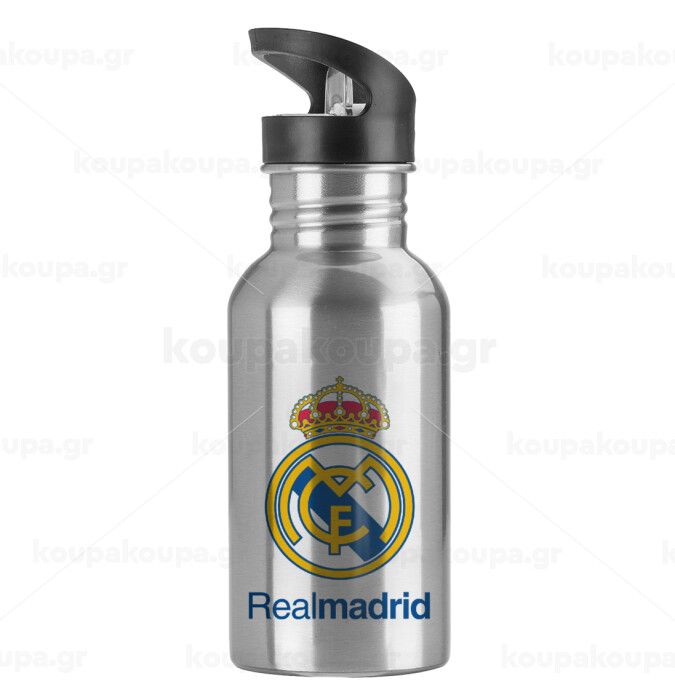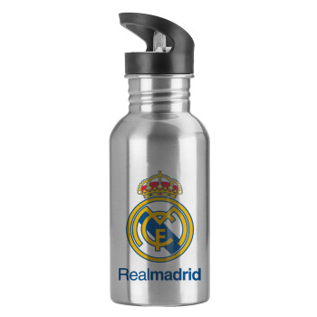 Real Madrid CF, Water bottle Silver with straw, stainless steel 600ml