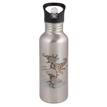 Christmas nordic gnomes, Water bottle Silver with straw, stainless steel 600ml