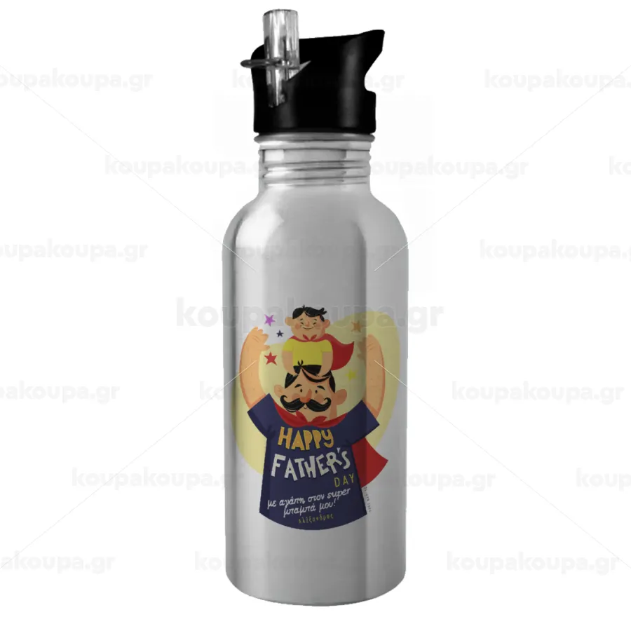 Happy Fathers Day με όνομα, Water bottle Silver with straw, stainless steel 600ml