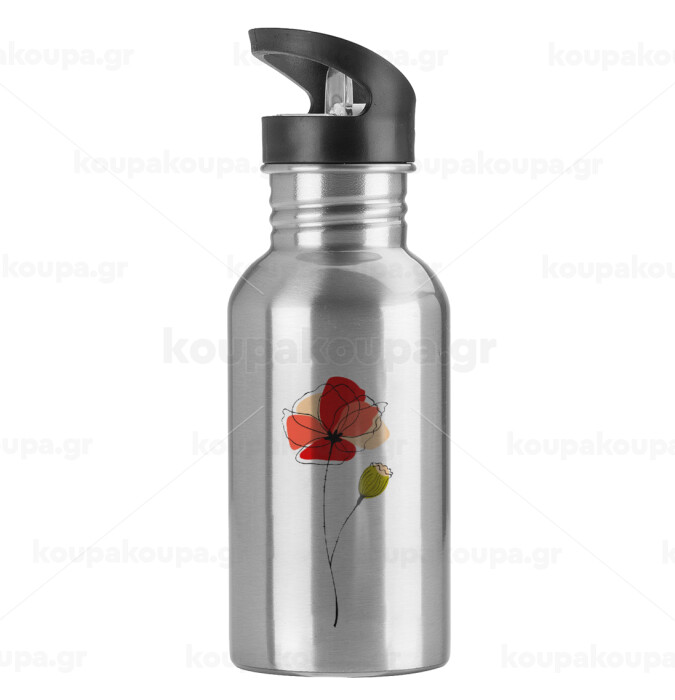 Red poppy flowers papaver, Water bottle Silver with straw, stainless steel 600ml
