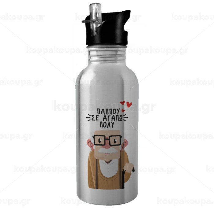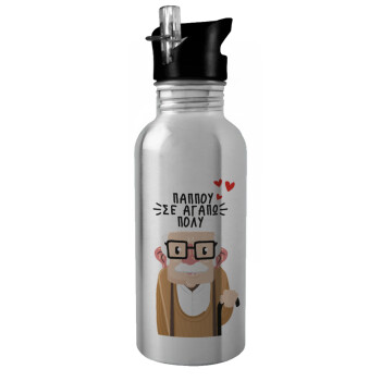 Παππού σε αγαπώ πολύ!, Water bottle Silver with straw, stainless steel 600ml