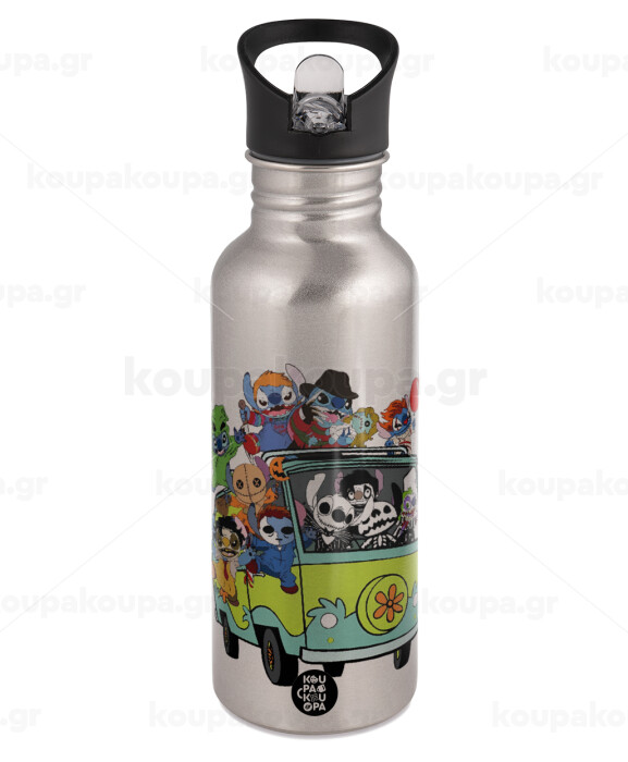 Stitch Halloween scooby car, Water bottle Silver with straw, stainless steel 600ml
