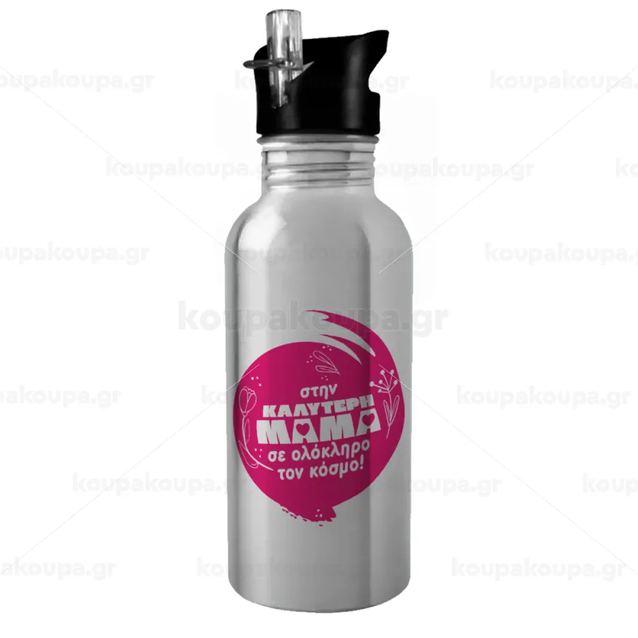 Στην καλύτερη μαμά του κόσμου!, Water bottle Silver with straw, stainless steel 600ml