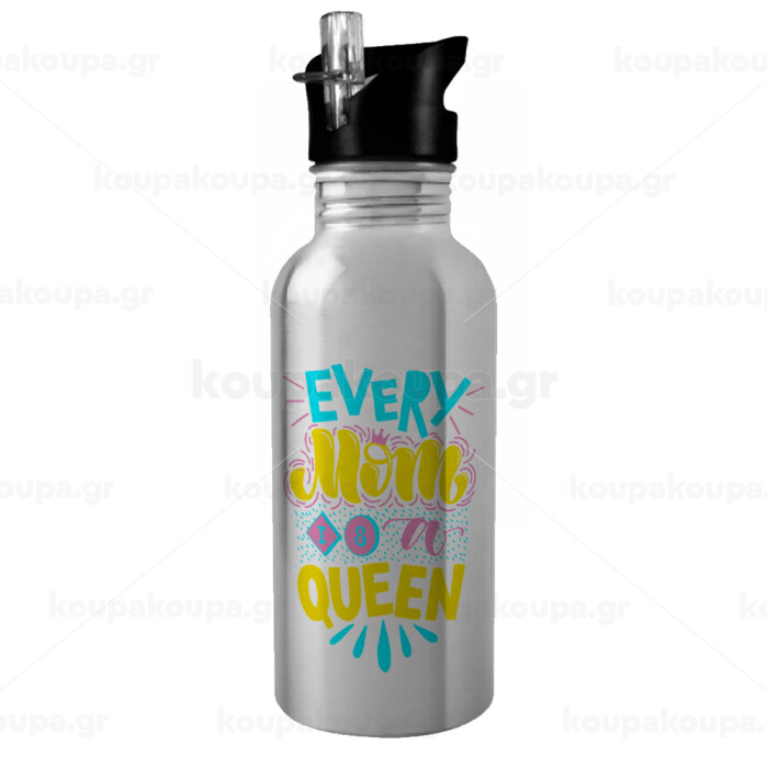 Every mom is a Queen, Water bottle Silver with straw, stainless steel 600ml