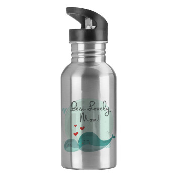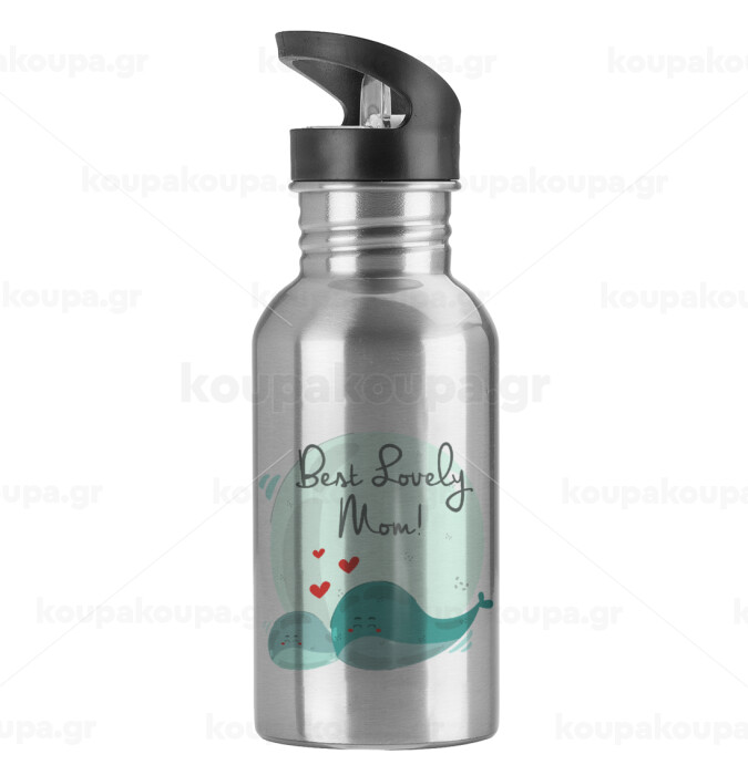 Mothers Day, whales, Water bottle Silver with straw, stainless steel 600ml