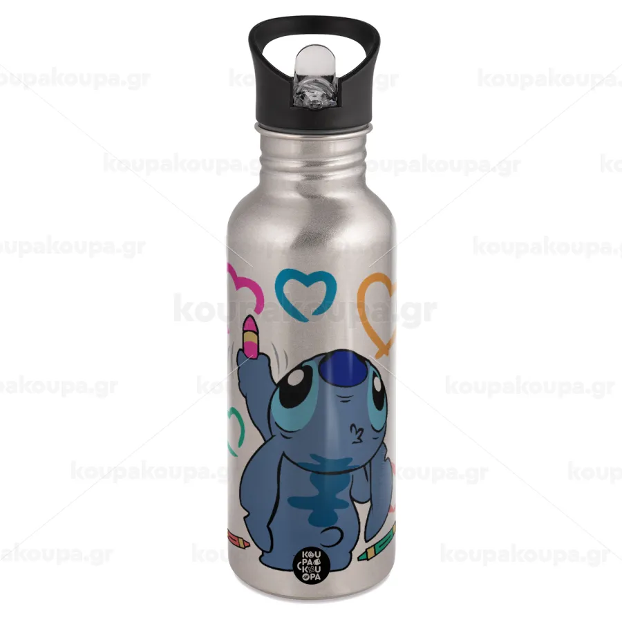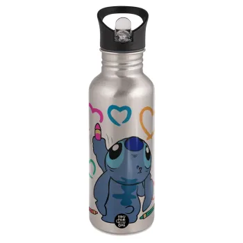 Lilo & Stitch painting, Water bottle Silver with straw, stainless steel 600ml