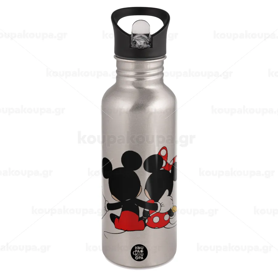 mickey and minnie hags, Water bottle Silver with straw, stainless steel 600ml