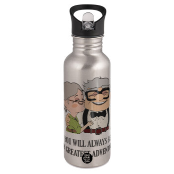 UP, YOU WILL ALWAYS BE MY GREATEST ADVENTURE, Water bottle Silver with straw, stainless steel 600ml