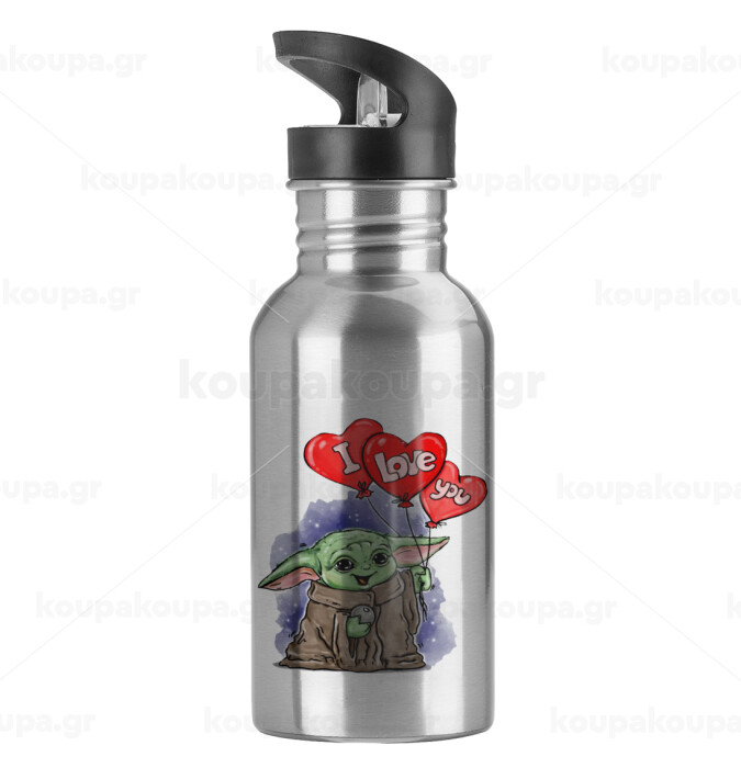 Yoda, i love you, Water bottle Silver with straw, stainless steel 600ml