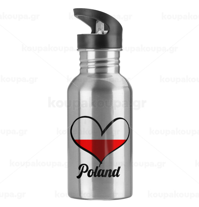 Poland flag, Water bottle Silver with straw, stainless steel 600ml