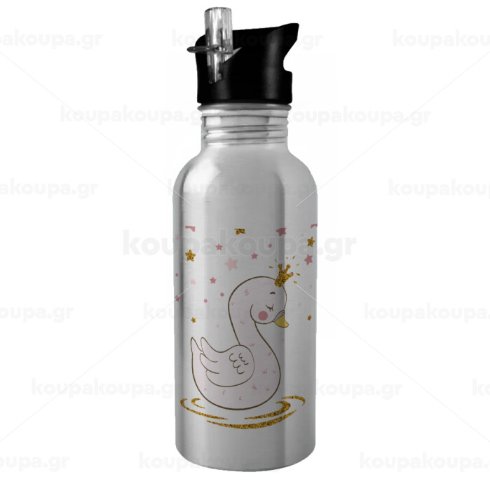 Crowned swan, Water bottle Silver with straw, stainless steel 600ml