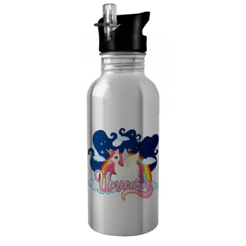 Μονόκερος, Water bottle Silver with straw, stainless steel 600ml