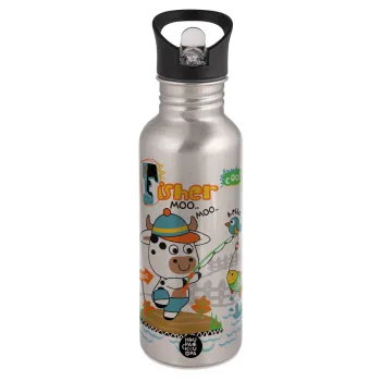 Kids Fisherman, Water bottle Silver with straw, stainless steel 600ml