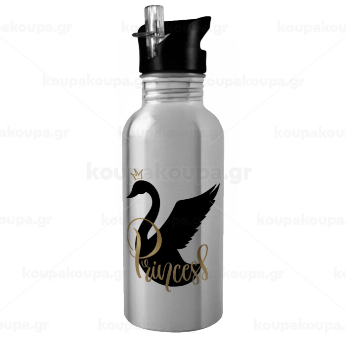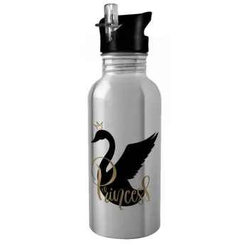Swan Princess, Water bottle Silver with straw, stainless steel 600ml