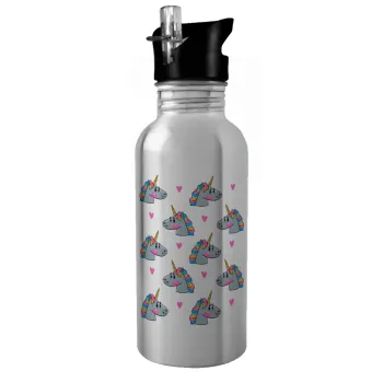 Unicorn, Water bottle Silver with straw, stainless steel 600ml