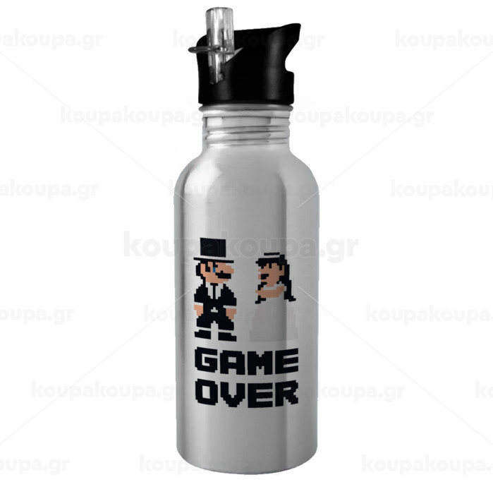 8bit Game Over Couple Wedding, Water bottle Silver with straw, stainless steel 600ml